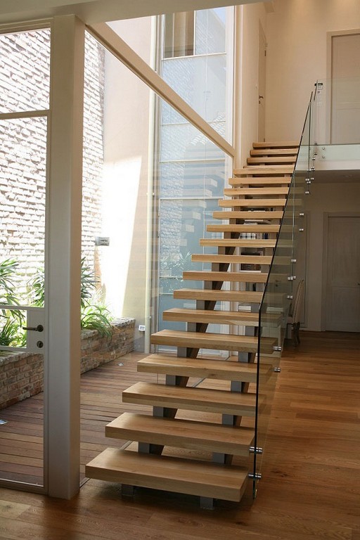 מעקה זכוכית עם מדרגות מתכת ועץ